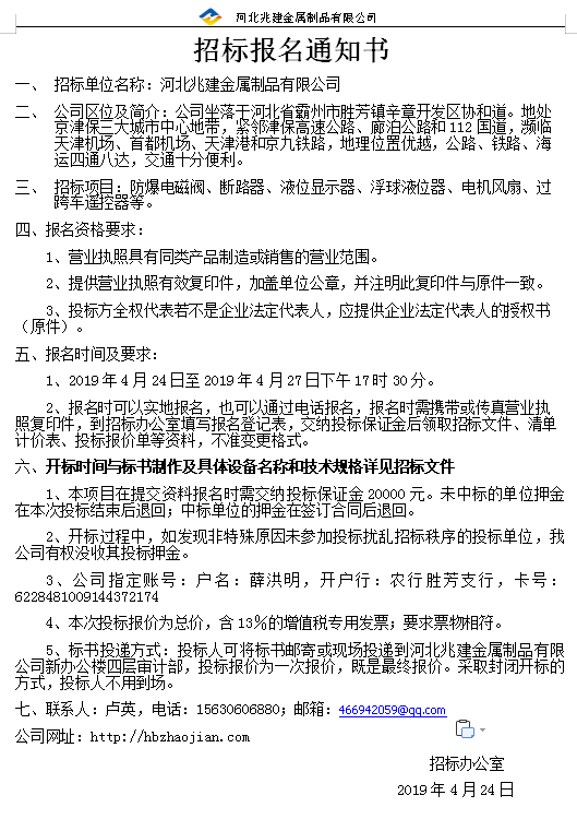 • 招標(biāo)業(yè)主: 河北兆建金屬制品有限公司