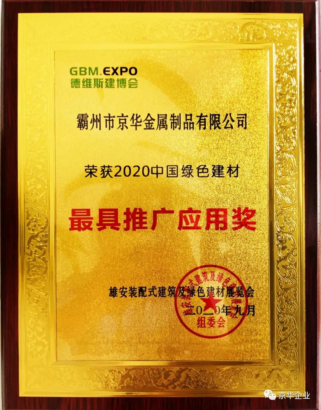 雄安德維斯建博會作為雄安新區(qū)的標(biāo)桿性展會,會上,京華企業(yè)以卓越的產(chǎn)品質(zhì)量和先進(jìn)的生產(chǎn)技術(shù)以及標(biāo)準(zhǔn)化的銷售服務(wù)榮獲2020中國綠色建材“最具推廣應(yīng)用獎(jiǎng)”。
