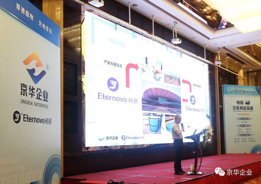 在接下來(lái)的一小時(shí)時(shí)間里,京華企業(yè)“恒新“品牌營(yíng)銷副總李明曄先生,從企業(yè)實(shí)力和品牌定位,新型鋅鋁鎂基材以及全系列”恒新“彩涂產(chǎn)品線,”恒新“產(chǎn)品定制服務(wù)三方面向與會(huì)嘉賓做了全面的講解,全方位立體化向大家詳細(xì)闡述了”恒新“產(chǎn)品解決方案的獨(dú)特價(jià)值,以創(chuàng)新設(shè)計(jì)理念,幫助綠色建筑的節(jié)材,節(jié)水,節(jié)能,提升環(huán)境舒適度等各方面達(dá)成極大提升,以綠色理念幫助廣大客戶實(shí)現(xiàn)彩涂產(chǎn)品銷量的可持續(xù)增長(zhǎng)。